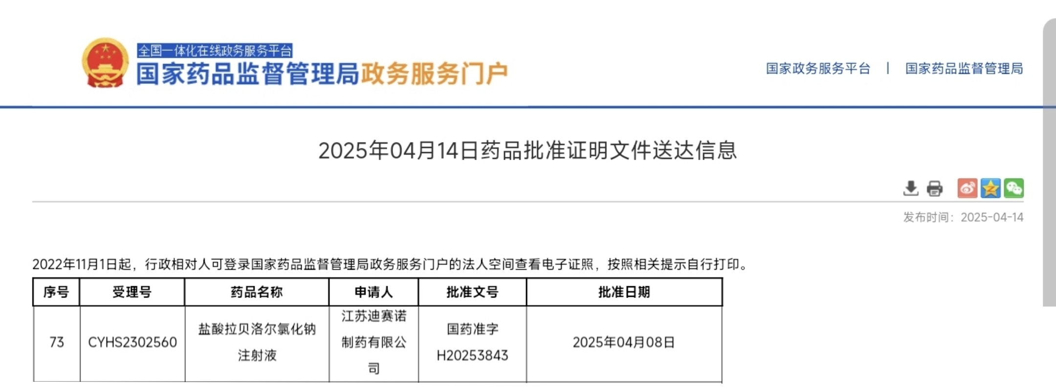 2025年4月8日,九州网页版登录入口的盐酸拉贝洛尔氯化钠注射液(国药准字H20253843)成功获得国家药品监督管理局(NMPA)批准上市,该产品是公司的化药3类仿制药,是该品种药物的国内首仿。这一成果标志着公司在心血管领域的产品布局迈上新台阶,也为广大患者提供了更优质的用药选择。